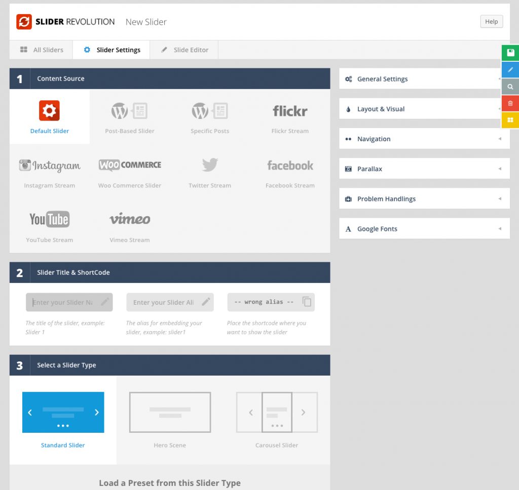 Vanuit de overzichtspagina van Revolution Slider, kunt u een nieuwe slider aanmaken via de knop ‘Create new slider’. Geef de nieuwe slider een titel, alias en kies het gewenste type slider.